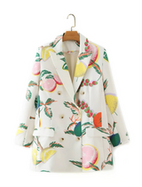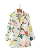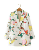 Effortlessly elevate your summer style with our lightweight fully lined Summer Fun Blazer. Featuring a playful fruit print, sophisticated button enclosure, and chic structure, this blazer is the perfect blend of casual and classy. Make a statement with fine print lines and stay cool in the heat.