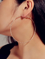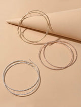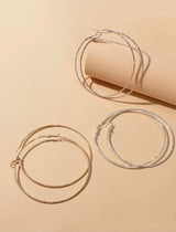 Set of three metal hoop earrings. Colors are rose gold, silver and gold. 3.5 inches wide.