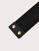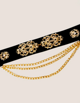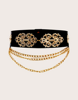 This Victoria Belt is 4 inches wide and made of vegan leather and black sturdy elastic. Features elegant gold metal appliques with rhinestone detail and 3 draped gold chains. Pair this belt with almost anything and instantly upgrade an outfit.