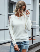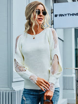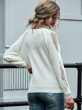 A sure show stopper! This cream cold shouldered sweater is made of a cotton and polyester blend and has a roomy/slight oversized feel with a ton of stretch. The shoulders feature laser cut-outs with soft lace sleeves underneath that span down to the wrist area.. The lace is only on the sleeves and not the body of the sweater.