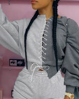 This 2-toned gray color block jogger set features a lace up front and matching solid gray joggers. Lined with a thick quality material. Pants are normal length.