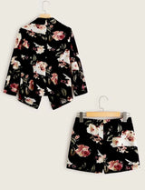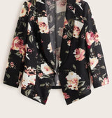 Rosy floral blazer features a shawl/tuxedo collar with three quarter length sleeves, removable shoulder pads and a ton of stretch! Winged front cut at the bottom gives the set a classic look. Very soft and medium thickness. Made of a polyester and spandex blend.