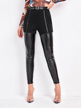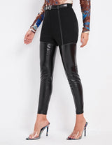 Unique and chic describe these mixed material bottoms. With an elastic waist, the top features a stretchy cotton material while the bottom features a stretchy vegan leather with a vegan leather garter detail and attached front belt. Tons of stretch!
