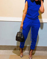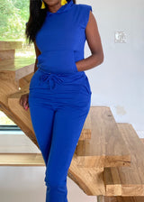 Very lightweight two-piece navy blue jogger set. This set has a ton of stretch and features hidden  shoulder pads adding a beautiful silhouette to the top. Pockets and a drawstring are featured on the lightweight stretchy jogger bottoms.