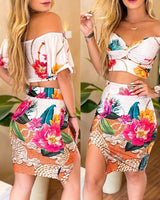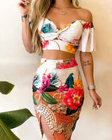 Very lightweight two-piece tropical print set made of a cotton and lycra blend making it super soft and stretchy providing the utmost comfort in summer months.