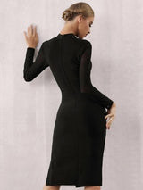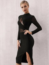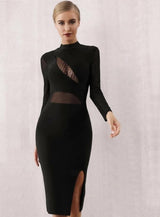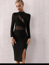 A great reason to wear black! This bodycon dress features a partial side split and sheer mesh contrast details in both the sleeves and front of the dress. The asymmetrical front slit has stone details around the bust area. Standing collar. Poly and spandex blend providing a slight stretch to the dress. Made of heavier quality material for an elegant look. Fits true to size!