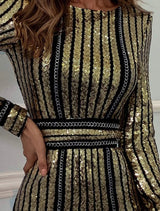 Beautiful black and gold striped sequin dress with a black and gold striped sequins corset-styled belt. Features a gold zipper closure and stretch. Simply gorgeous !