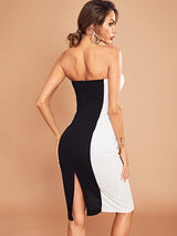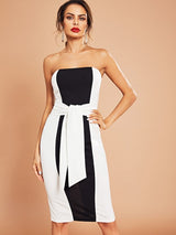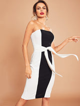Strapless color block dress with back zipper. The belt is sewn on both sides to tie and accentuate the waist. Perfect for date night or paired with a blazer for a day to night look!