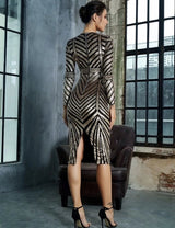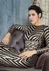 Beautiful and glamorous at it's best. This round neck bodycon inspired pencil dress has a very slimming pattern of light gold sequins set on a black gown. It is made up of both polyester and spandex, giving it a very comfortable fit and stretch. It features a zippered back and soft cotton blend slip underneath. Fits true to size.