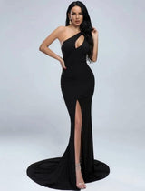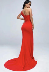 Available in red and black. This one shoulder dress features inside pads providing support and a one shoulder front cut-out detail providing a bit of glamour and sexiness. It features a high waist and mermaid bottom. Zippered back and thigh high split. Made of a polyester and spandex blend making it a heavier and more quality feel. Some stretch. Fits true to size.