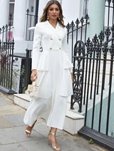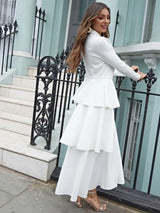 This elegant white dress can be worn as either a dress or overcoat. It features layered tiered hems in the front with gold accent buttons and the layers are carried around the back of the dress. It has a ton of movement and the fabric has a heavy feel of luxury and quality. Made of polyester and spandex.