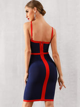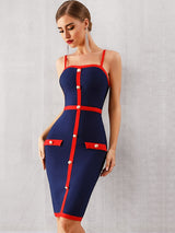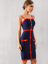 This elegant bodycon slip dress is navy with red detailed stripes and gold buttons. It features a back zipper and has a lot of stretch. It's spaghetti strap sleeves and silhouette shape is sure to make the room watch when you enter.