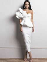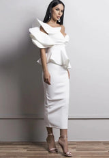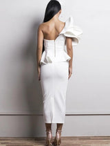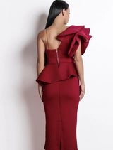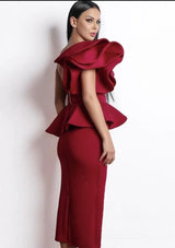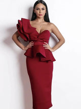 This one shoulder exaggerated ruffle dress features an exaggerated detail shoulder and clear bra strap to hold up the exposed shoulder side.  Simply elegant and glamours with a twisted front detail and peplum pencil bottom ruffle.This beautiful dress has a high amount of stretch and features a zippered back.  The material is a "scuba fabric" which has double stitching and exudes a high quality materiel finish.