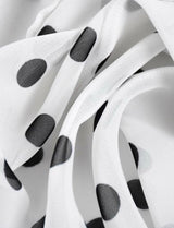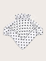 Black and white spotted face covering that is both a mask that doubles as a neck scarf when not being worn as a mask.  Comfortable and loose fit around the neck. Features adjustable ear straps for personalized comfort.  A perfect solution for those who want to wear a face mask, but with style! Fashionable and functional. Machine washable and reusable!