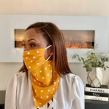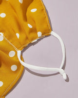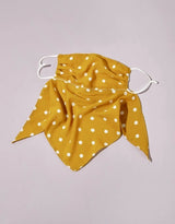 Gold and white spotted face covering that is both a mask that doubles as a neck scarf when not being worn as a mask.  Comfortable and loose fit around the neck.  Features adjustable ear straps for personalized comfort.  A perfect solution for those who want to wear a face mask, but with style! Fashionable and functional. Machine washable and reusable!