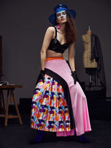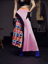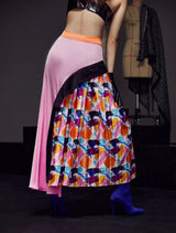 Beautiful box-pleated avant garde skirt with a black panel and circle line finish. Features bold hues that can be paired perfectly with a solid top. Some stretch.
