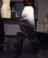 Set with an ombre tone and made of brushed cotton and denim. High-waist fit with a zippered front or side closure. Asymmetrical hemline. Chic and perfectly pairs with a variety of patterns.