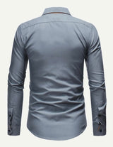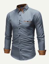 This crisp blue button down features a faux saddle brown suede collar and  brown suede plackets.  The same suede detail is carried on the cuffs. Intricate brown stitching adorns the front of the shirt.  Made of a cotton blend with a satin finish.