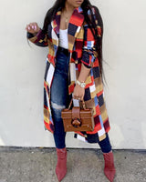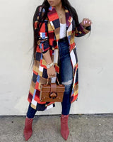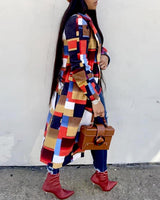 Warm, chic, color-blocked trench coat features a buttoned front and lined inside. Beautiful and vibrant geometric colors make this coat a shop stopper! Soft, warm and lined.