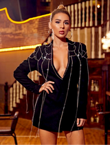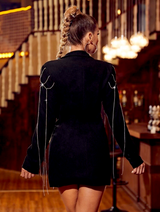 This black glamorous blazer dress features a lapel front adorned with rhinestones and fringe rhinestones hanging across the front. Features a button front closure and can be worn as a blazer or dress. Made of a cotton blend, and feels like a soft brushed suede.