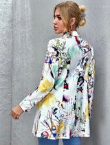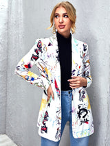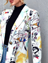Casual, yet chic describes this light-weight graphic blazer. Versatile enough to be layered in colder weather, yet light enough to wear in spring/summer. This blazer is made of a cotton, polyester and spandex blend with a multi-color, pop art print. Single button closure. Features tons of stretch and movement.