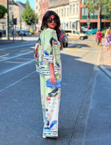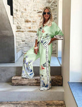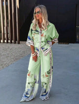 This two-piece button-down leisure set, available in mint green and baby blue, is designed for versatility and comfort. Crafted from soft sateen material featuring an elastic waist, it offers ease of movement. The chic racer stripe along the pants enhances its suitability for both casual and dressy occasions, making it a valuable addition to your wardrobe.