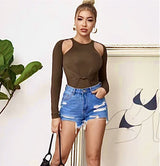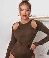 Beautiful and stretchy long sleeve twisted front brown bodysuit. Features front cutout detail around the shoulders and a twisted front to create an attractive waistline. High quality nylon and spandex fabric. Very stretchy.