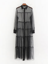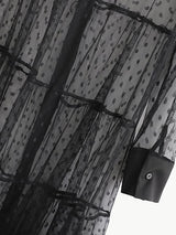 This long-sleeve sheer overlay dress is both sophisticated and sexy. It has long sleeves with a shift -swing design, adding a ton of movement. It is adorned with black small polka dot's and a sold black collar and cuffs. It soft, sophisticated and chic! Pair it with a dress or a casual outfit to add a bit of flair, either way, it's a must-have!