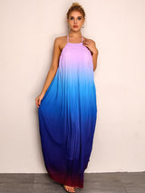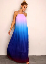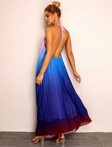 This beautiful ombré maxi dress has a lot of stretch and is very flowy. It is backless and ties around the back of the neck. It has a white attached under slip.